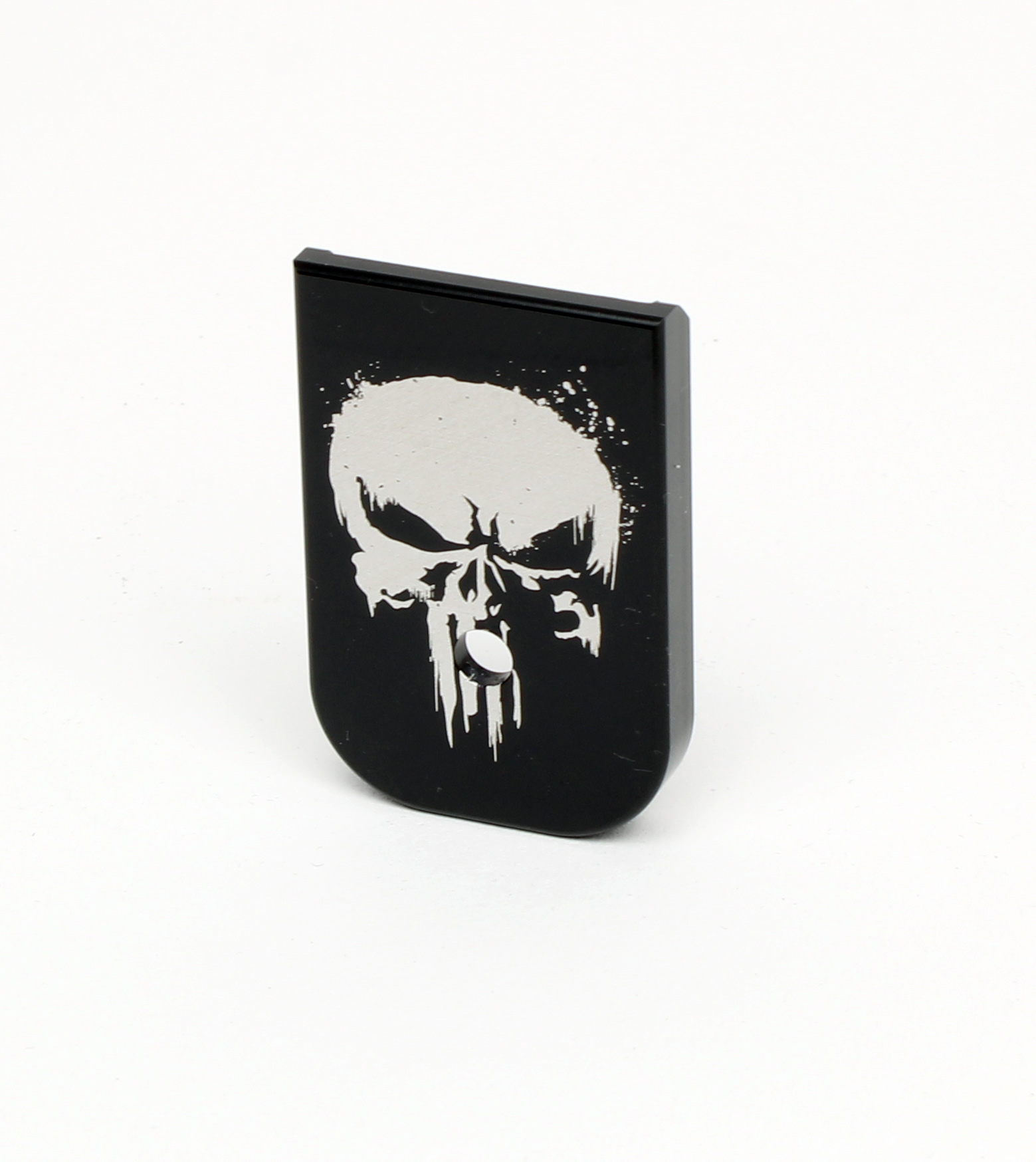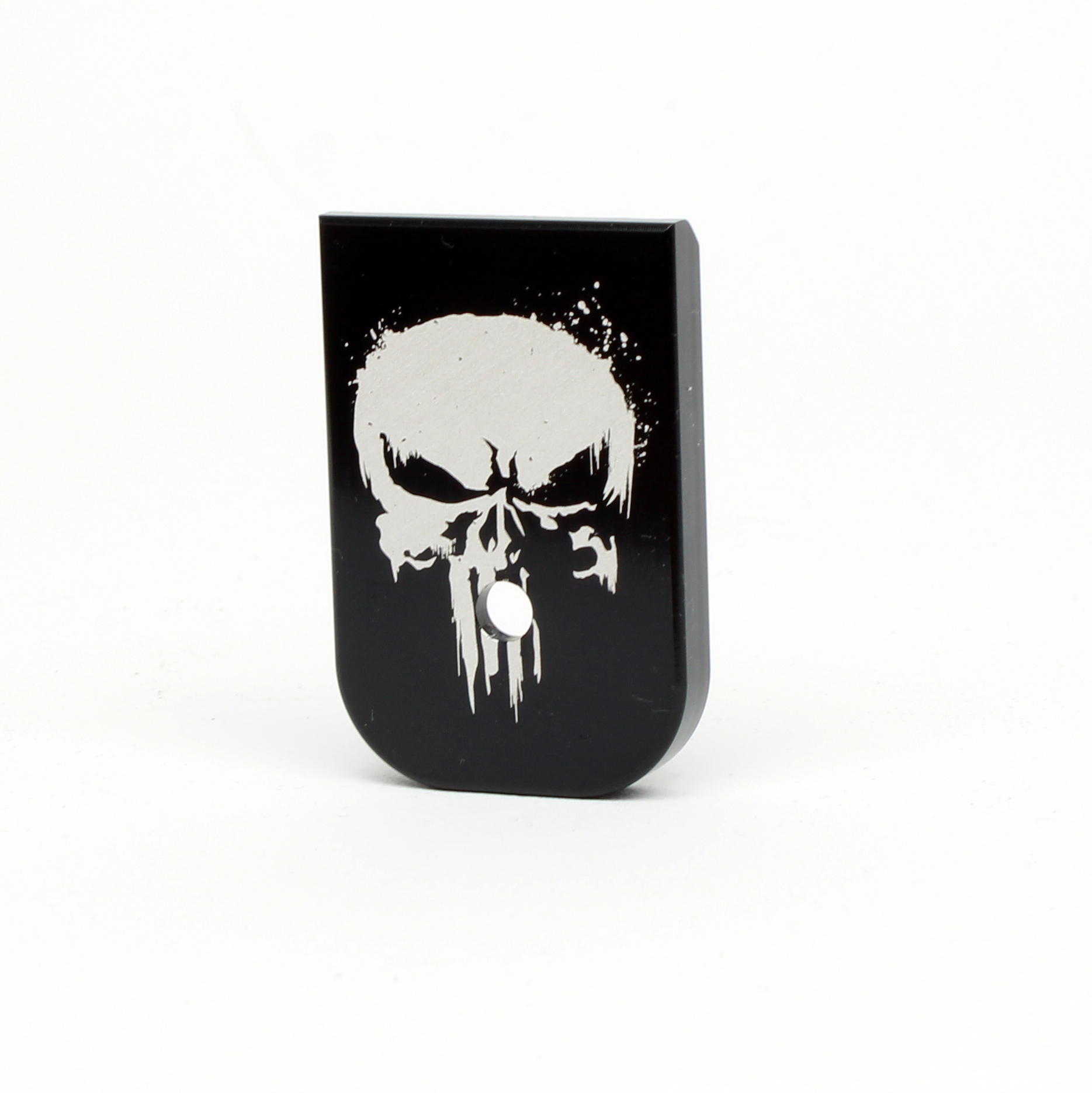Glock Magazin Base Plate aus gefrästem Aluminium mit Bad Punisher Motiv.