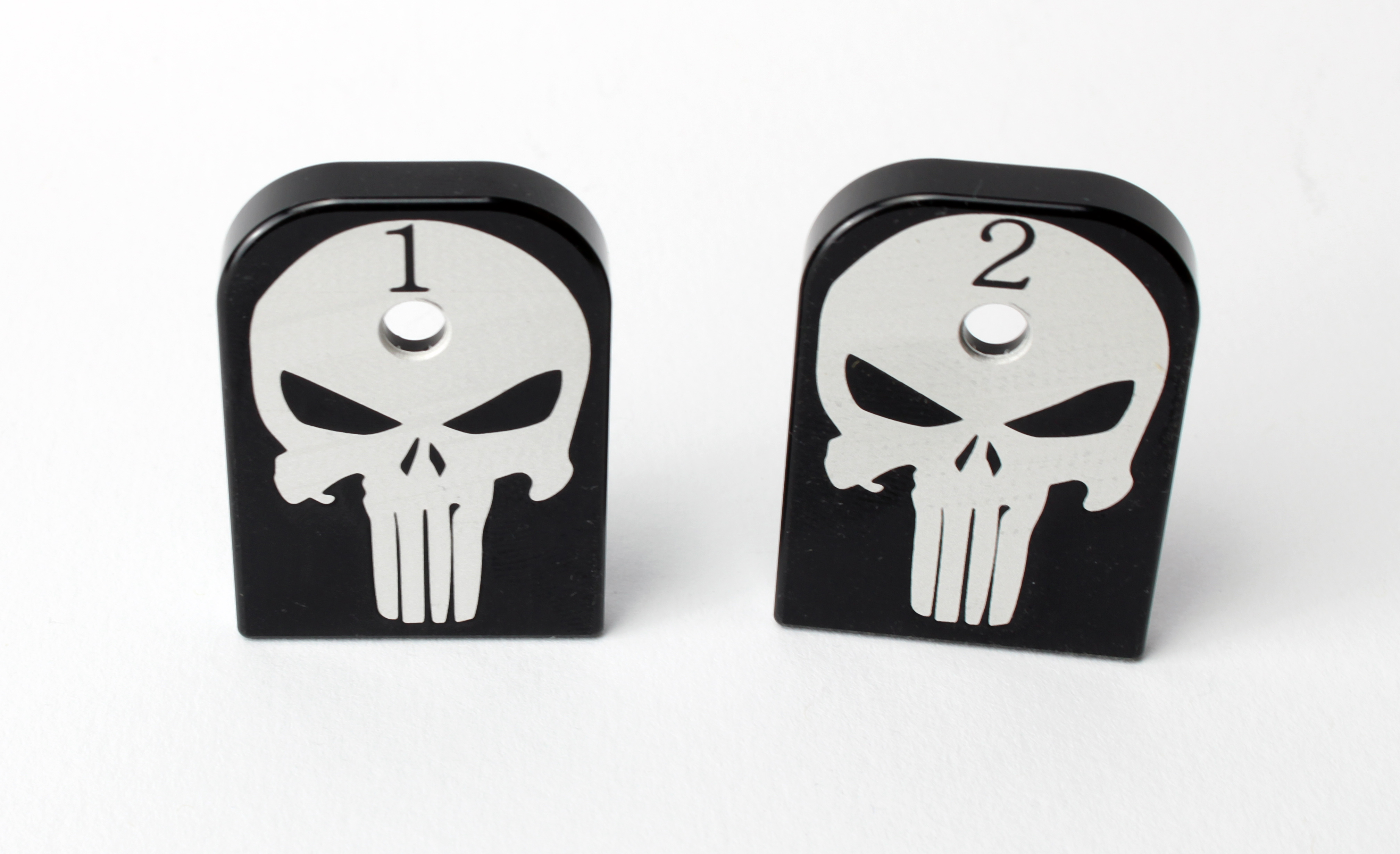 Glock Magazin Base Plate aus gefrästem Aluminium mit Punisher Motiv.